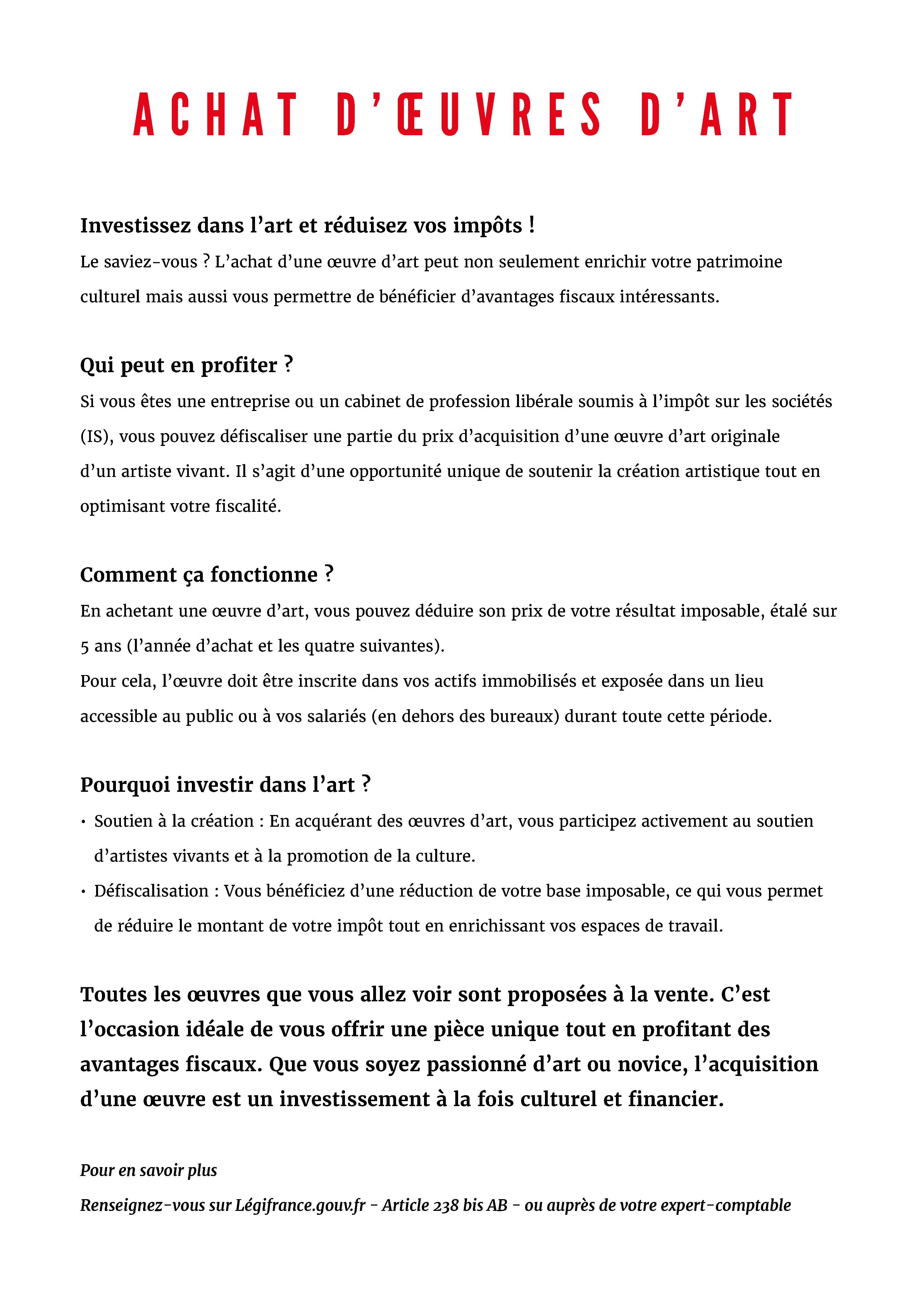 La loi n°2003-709, appelée "Loi sur le mécénat", renforce la mesure visant à promouvoir les dons et les achats d’art à des fins culturelles et éducatives. Retrouvez plus d’informations détaillées sur cette disposition sur Légifrance dans l’article 238 bis AB du CGI et dans les compléments législatifs à l’annexe III du CGI